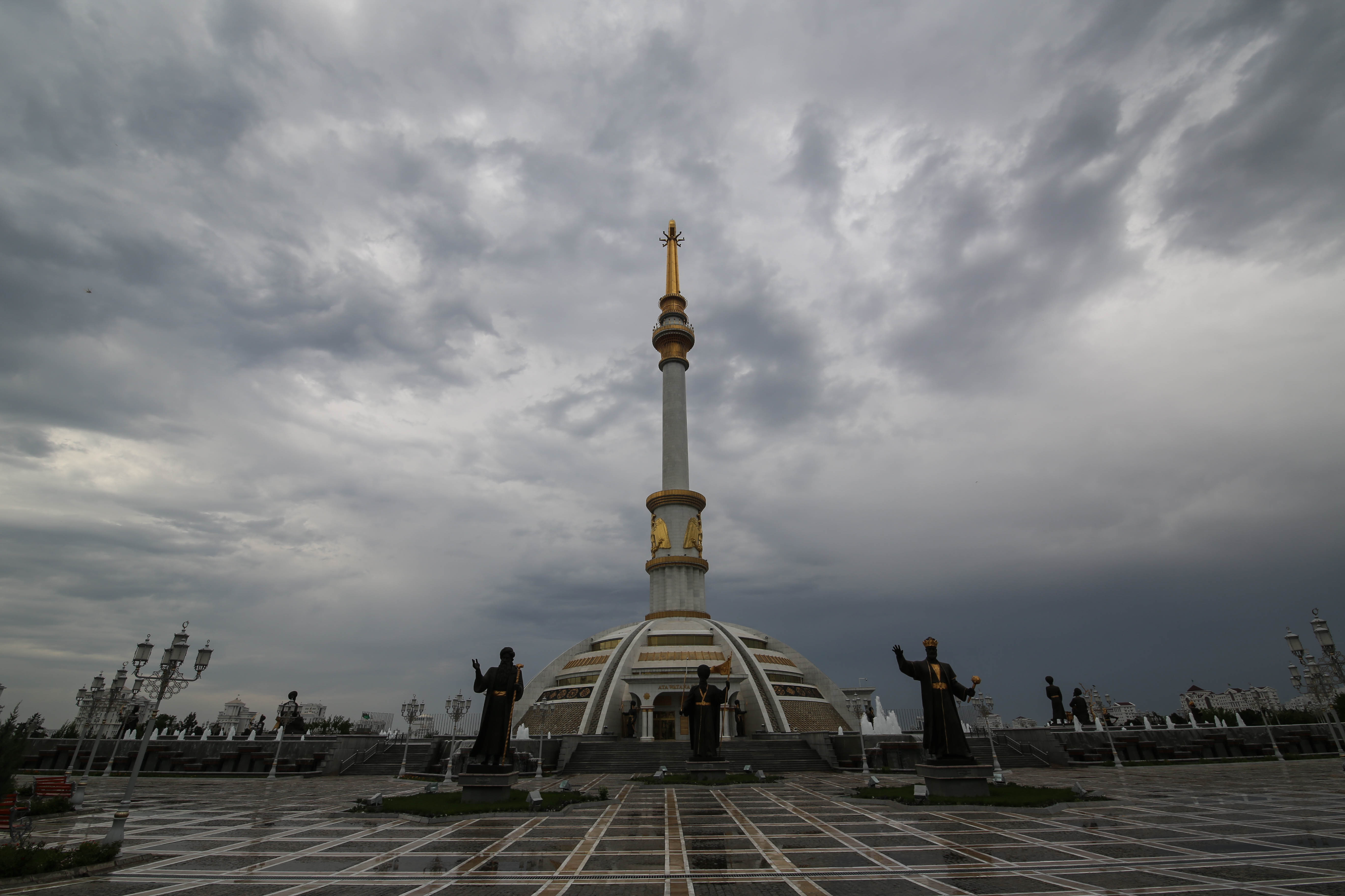 Bussen stannar vid neutralitetsbågen. Där uppe, på den 95 meter höga bågstrukturen står han, täckt av 12 kilo rent guld, elektroingenjören som blänker i solen och glänser i regnet. Personkulten kring honom är dock inte vad den en gång var. Men här, och på ett antal andra platser i Ashgabat står han i finkostym, med guldarmarna öppna som för att ge oss en kram, ett hjärtligt efterlängtat välkomnande.